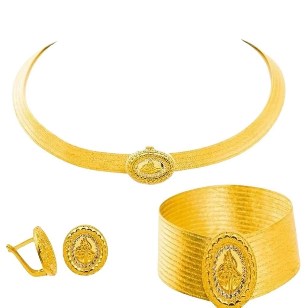Evla Kuyumculuk, geleneksel el işçiliği ve modern tasarımın mükemmel bir buluşması olan bu özel set takımı ile sizi eşsiz bir mücevher deneyimine davet ediyor. 14 ayar altınla ustalıkla işlenmiştir olan bu set,15 sıra Trabzon hasır modeli ile göz alıcı bir şıklığı temsil ediyor. Set, ağırlığıyla değil aynı zamanda tasarımındaki detaylarla da büyüleyici. Kolye, bilezik ve küpelerdeki 15 sıra Trabzon hasır örgü deseni, her parçanın zarafetini ve estetiğini vurguluyor. 85,00 gram ağırlığındaki bu set, etkileyici bir duruş sergilerken aynı zamanda kullanıcısına konfor sunuyor.