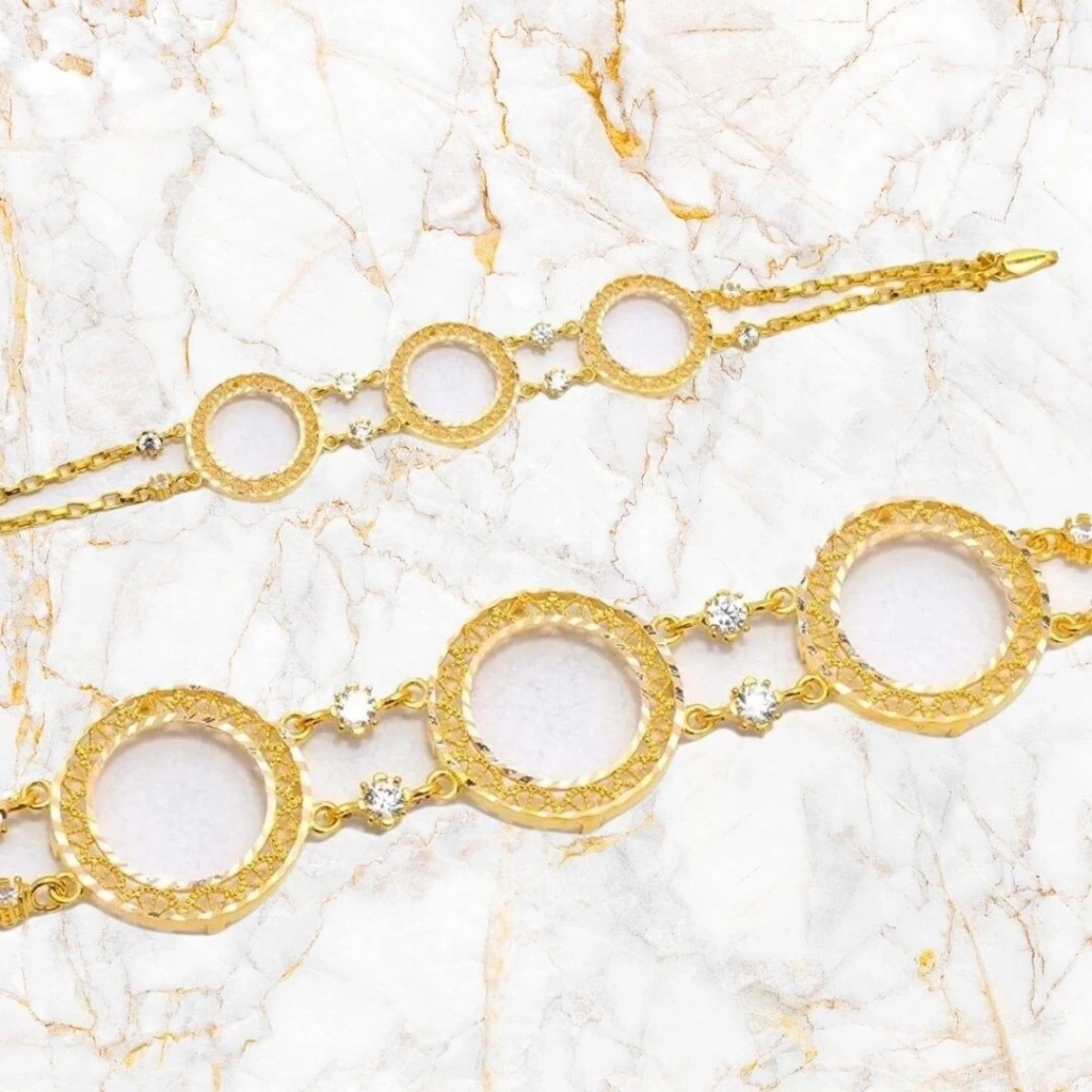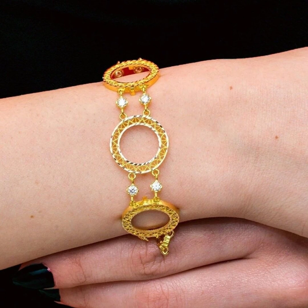 Evla Kuyumculuk'un özel tasarımı olan 14 Ayar Altın 3 Çerçeveli Çeyrekli Bileklik, göz alıcı bir takı parçasıdır. Bu bileklik, yüksek kaliteli 14 ayar altından üretilmiş olup, özgün tasarımıyla dikkat çekmektedir. Bilekliğin en belirgin özelliği, 8,86 gram ağırlığındaki üç adet altın çeyreksiz çerçeveleridir. Altın çeyrekler, bilekliğe değerli bir detay katar ve çekiciliğini vurgular. Üç çerçeve ise bilekliğe modern ve şık bir görünüm kazandırır.