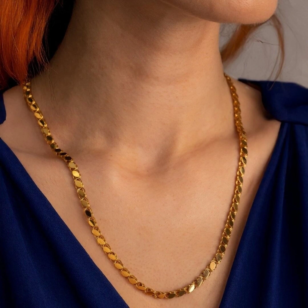 Evla Kuyumculuk’un en sevilen tasarımlarından biri olan 14 Ayar Altın Kalın Pullu Zincir 11,90, 11,90 gram ağırlığında ve 50 cm uzunluğundadır. Zincir, şık ve modern bir görünüm sunan kalın pullu zinciri tasarımına sahiptir.