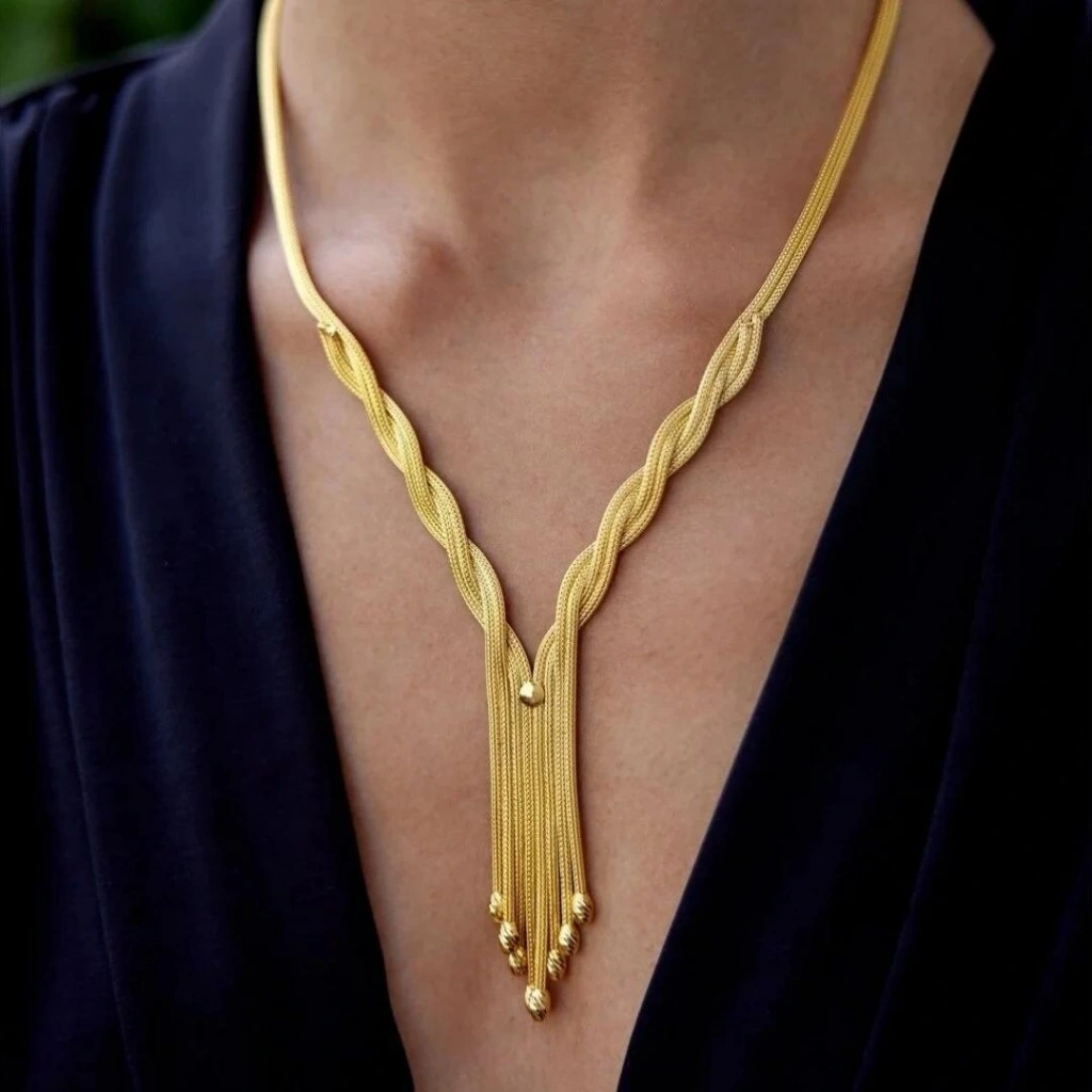 Kolye, 45 cm uzunluğundadır ve mesh örgü şeklindedir.