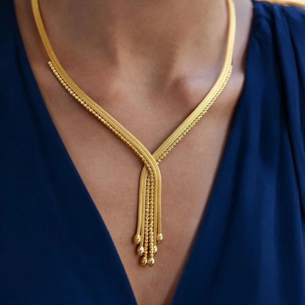 Kolye, 45 cm uzunluğundadır ve mesh örgü şeklindedir.