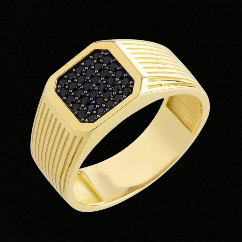 14 Ayar Altın Siyah Taşlı Erkek Yüzüğü 5,19 Gram : Bu 14 Ayar Altın Siyah Taşlı Erkek Yüzüğü, Evla Kuyumculuk tarafından özenle tasarlanmış ve üretilmiş bir mücevherat ürünüdür. Yüksek kaliteli malzemeler ve dikkatli işçilikle yapılan bu yüzük, şık ve etkileyici bir görünüme sahiptir.Yüzüğün yapımında 14 ayar altın kullanılmış olup, toplamda 5,19 gram ağırlığındadır. Yüzüğün tasarımında siyah taşlar kullanılarak benzersiz bir estetik yakalanmıştır. Siyah taşlar, yüzüğe modern ve sofistike bir dokunuş katar.