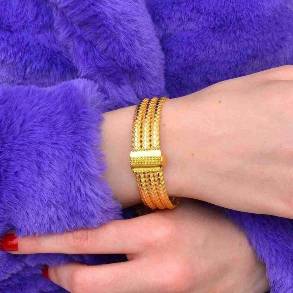 Evla Kuyumculuk'un özel koleksiyonundan 14 Ayar Altın Trabzon Hasır Kelepçe, zarafet ve şıklığı bir araya getiren özel bir kuyumculuk ürünüdür. Bu kelepçe, yüksek kaliteli 14 ayar altın kullanılarak özenle tasarlanmış ve işlenmiştir. Trabzon hasır deseniyle süslenen bu kelepçe, benzersiz bir görünüm sunar ve her türlü kıyafetle mükemmel bir uyum sağlar. Bu özel kelepçe, 16,24 gram ağırlığıyla sağlam ve gösterişli bir yapıya sahiptir. Bu sayede bileğinizi etkileyici bir şekilde süsler ve şıklığınızı vurgular. Trabzon hasır deseni, kelepçenin üzerindeki örgü detaylarıyla birleşerek göz alıcı bir etki yaratır.