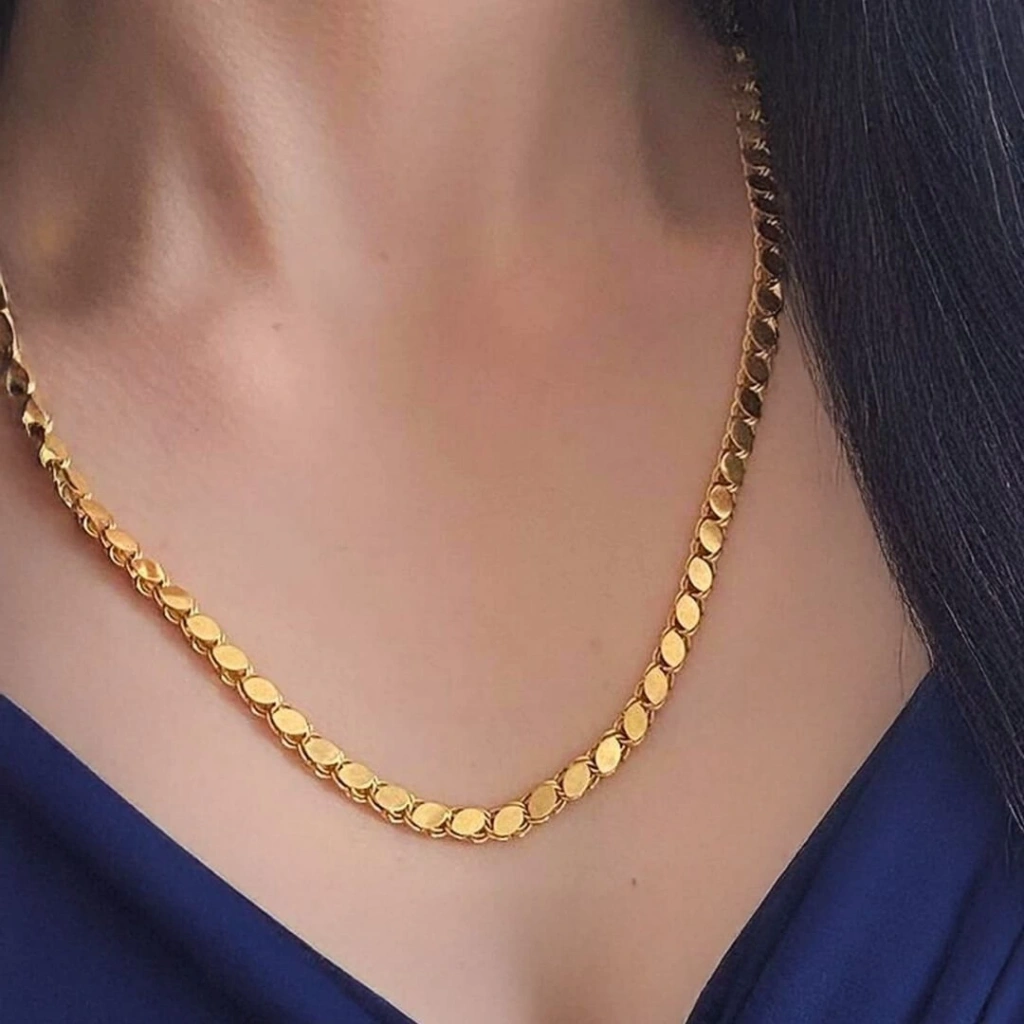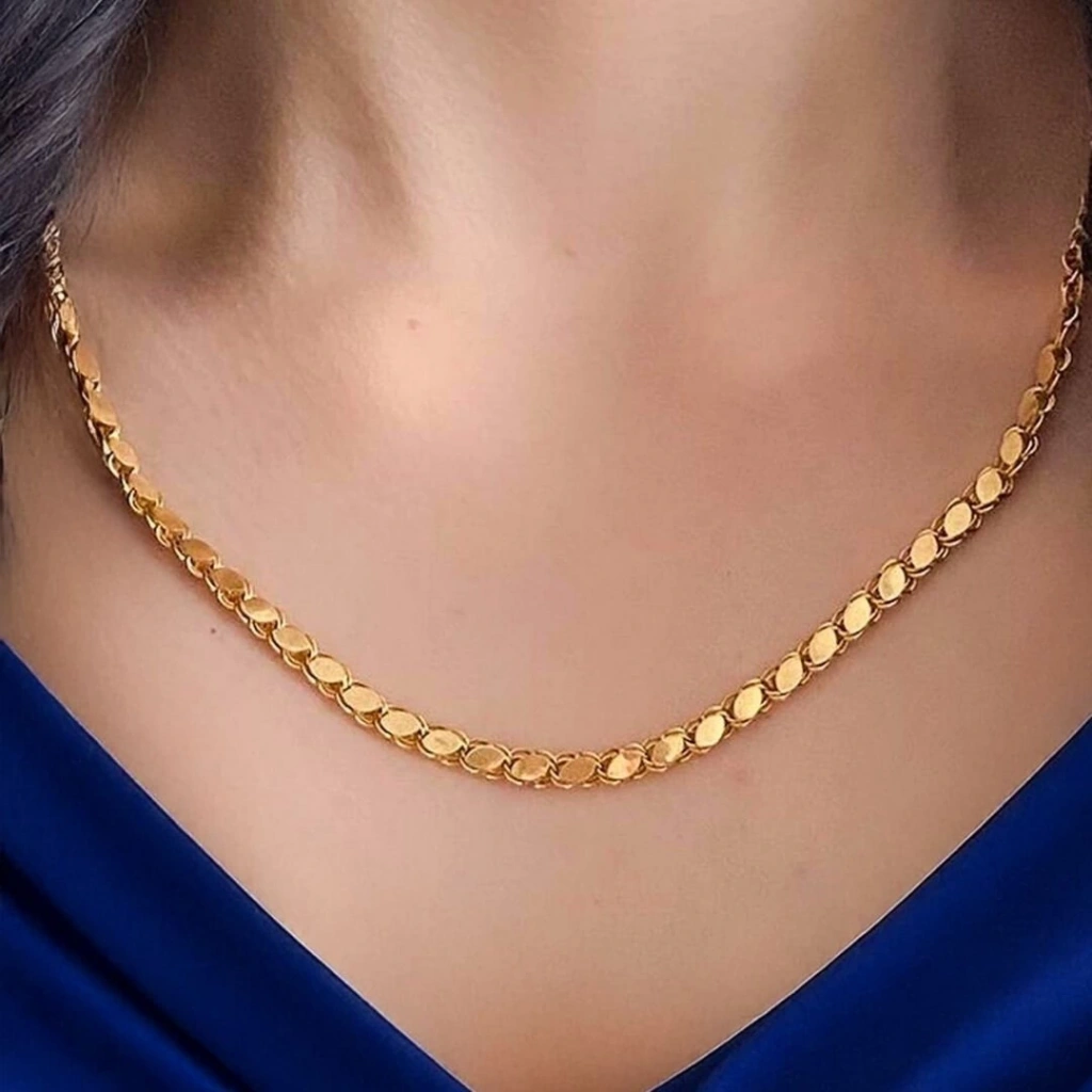 Gündelik kullanımda ve özel günlerde tercih edilebilecek şık ve modern bir altın pullu zincir modelidir.