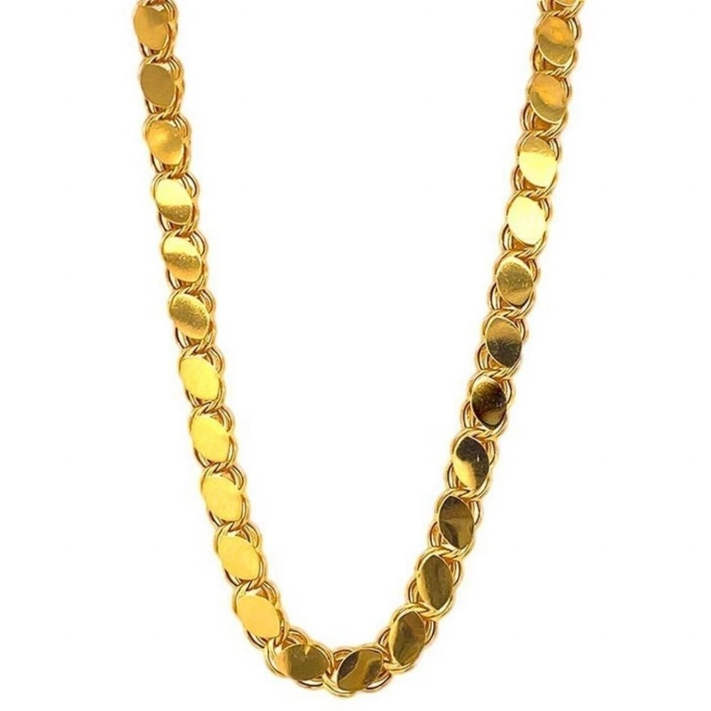Işıltısıyla göz kamaştıran bu özel Altın Pullu Zincir,  55 cm uzunluğu ve 4 mm genişliği ile evla kuyumculuk güvencesi ile sizlere en uygun fiyat sunmak amacıyla altın zincir olarak tasarlandı. 22 ayar altın renginde parlak görünümü sayesinde daha değerli ve dikkat çekici bir duruş sunar.