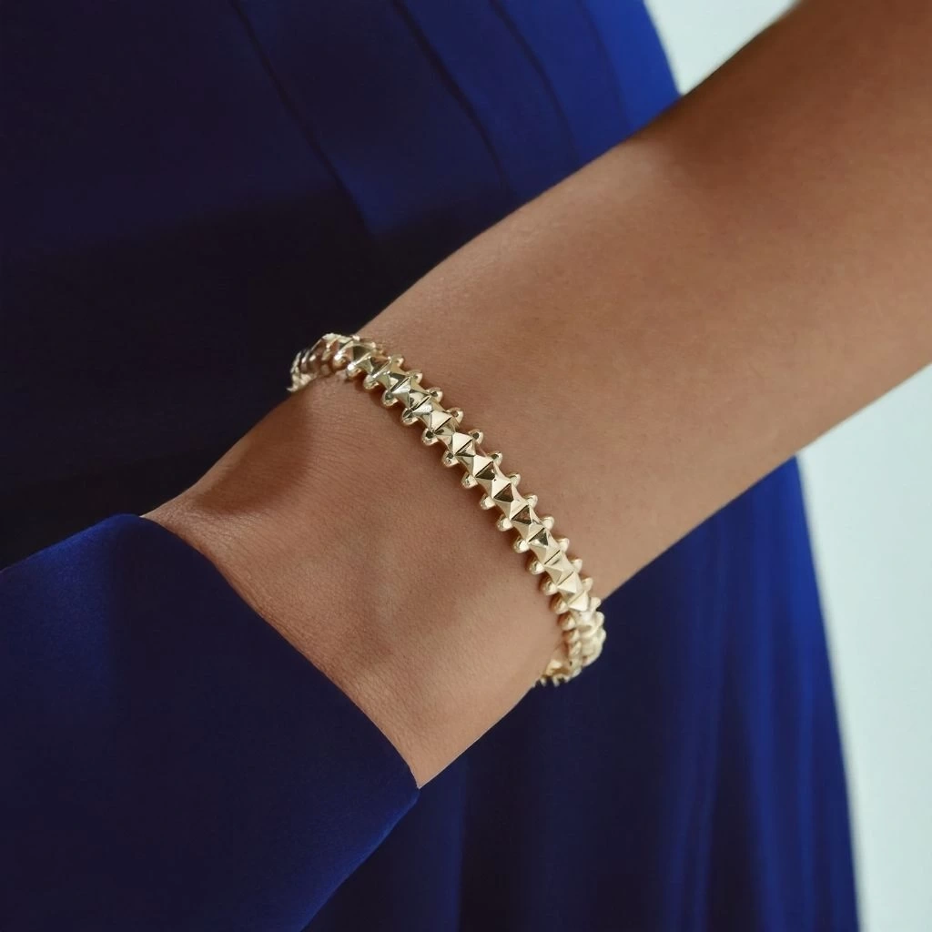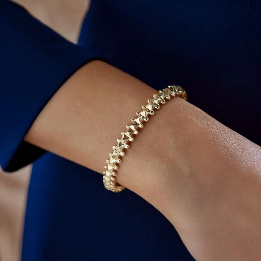 Göz alıcı piramit detaylarıyla tasarlanmış bu kelepçe, modern çizgileriyle hem günlük kullanıma hem de özel davetlere uyum sağlar. 14 ayar altının sağlamlığı ve parlaklığıyla üretilen bu model, uzun yıllar değerini korur. 11 gramlık ağırlığıyla hem zarif hem de kullanışlıdır.