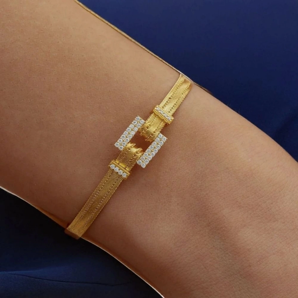 Taşlı detaylar, kare formda trabzon örgüsüyle birleşerek zarafet ve ihtişamı bir arada sunar. Düğün, nişan, söz ve özel günlerde tercih edilebilecek bu özel tasarım, Evla Kuyumculuk kalitesiyle sizlere sunulmaktadır.
