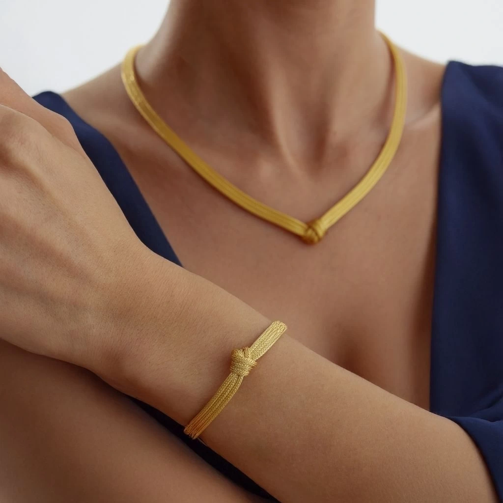 Klasik kalze örgüsünü modern üçlü düğüm detayıyla buluşturan bu set, hem zarif tasarımı hem de 14 ayar altının sağlamlığıyla uzun yıllar kullanılacak değerli bir takıdır. 17,20 gramlık kolye ve 8,60 gramlık bileklikten oluşan bu özel set, hem günlük şıklığı hem de özel günlerdeki ihtişamı yansıtır.